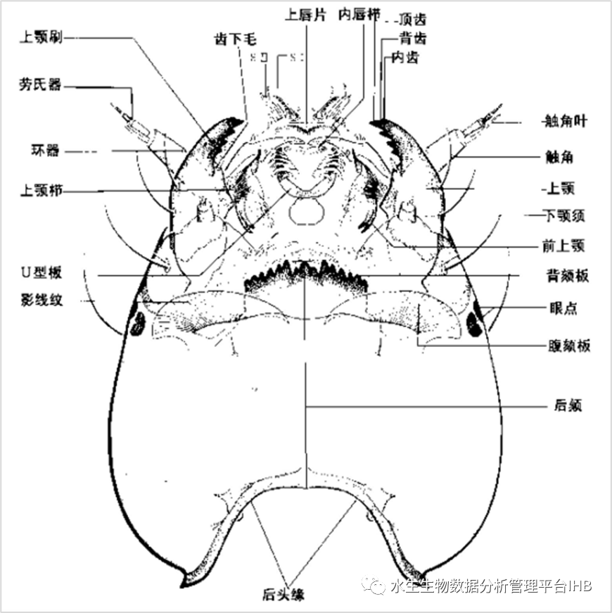 (1)搖蚊亞科幼蟲頭部解剖結構示意圖;
